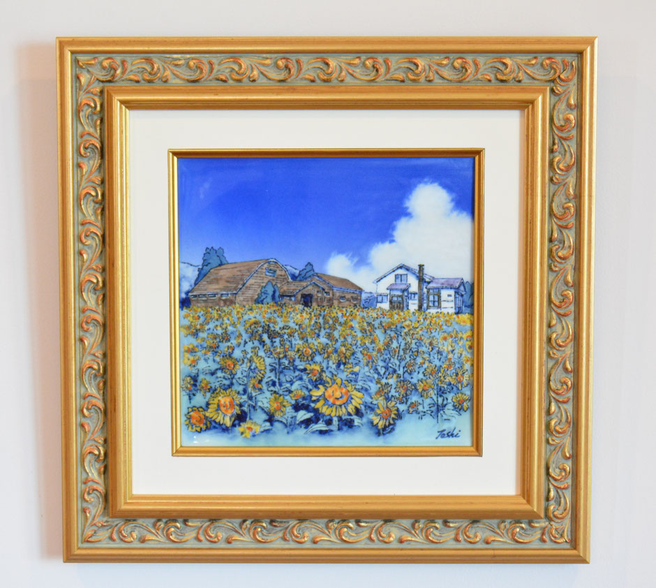 辻聡彦作 線刻絵付け陶板「ひまわり畑」