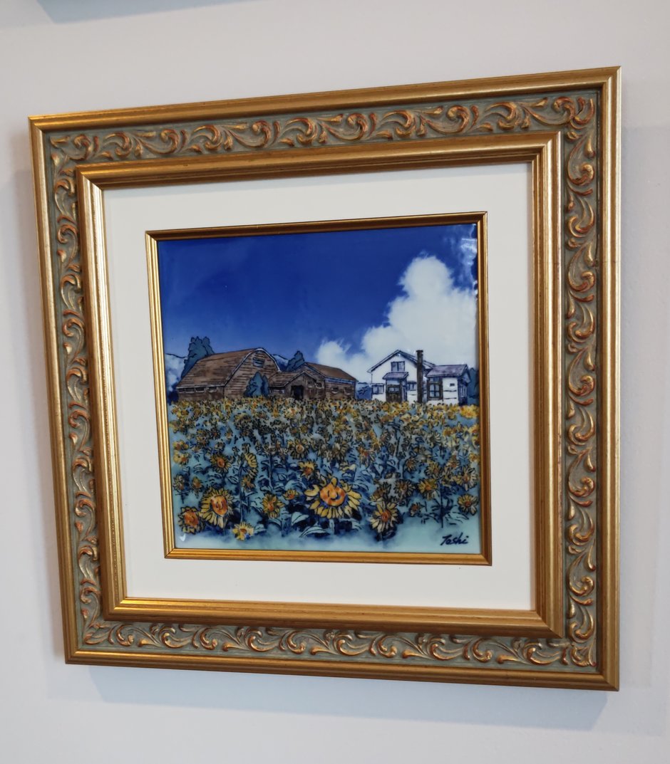 辻聡彦作 線刻絵付け陶板「ひまわり畑」