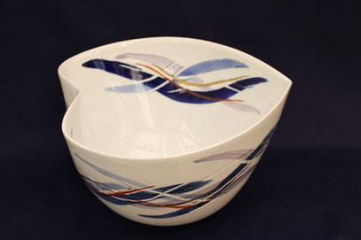 He creates works using “ incise technique “ on the canvas of white porcelain . His touch is dynamic yet delicate and his view of art shows the infinite expanse with a variety from natural land scape to abstruct.